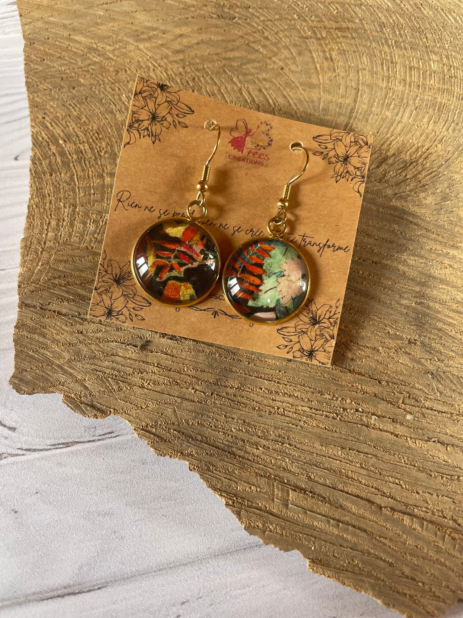 Crées à partir de chutes de tissus revalorisées, elles subliment un délicat motif foral protegé sous un cabochon en verre, pour un rendu lumineux et intemporel.